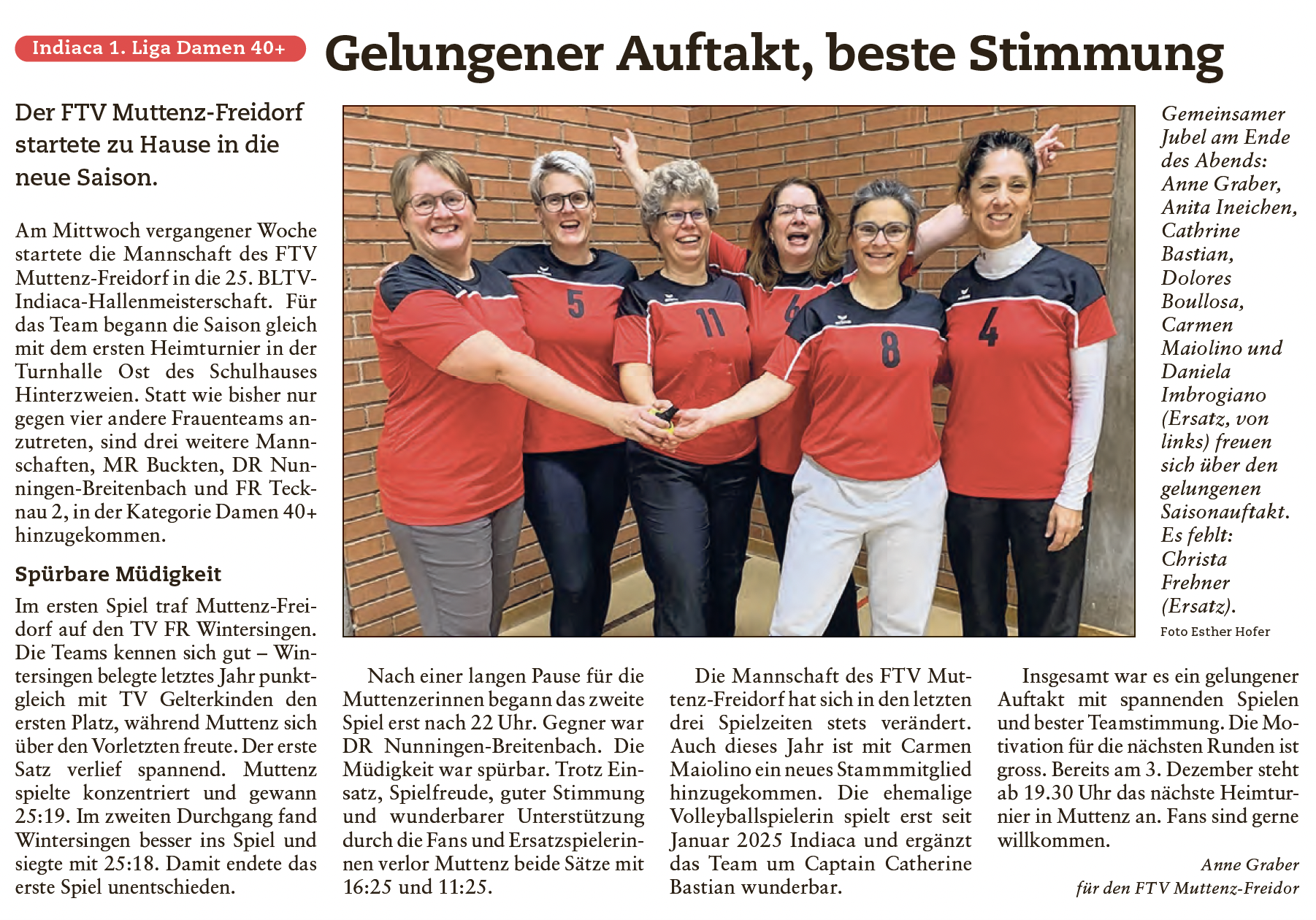 Das Indiaca Team um Captain Catherine Bastian ist dieses Jahr gut in die neue Saison der 25. BLTV Indiaca-Hallenmeisterschaft gestartet. Im Spiel gegen TV FR Wintersingen konnte der erste Satz mit 25:19 gewonnen werden, im Zweiten fand Wintersingen besser ins Spiels und gewann 25:18. Gegen den starken Neuzugang in der Liga DR Nunningen-Breitenbach fand das Team des FTV nicht richtig ins Spiel und verlor beide Sätze, geschuldet sicher auch der späten Zeit.